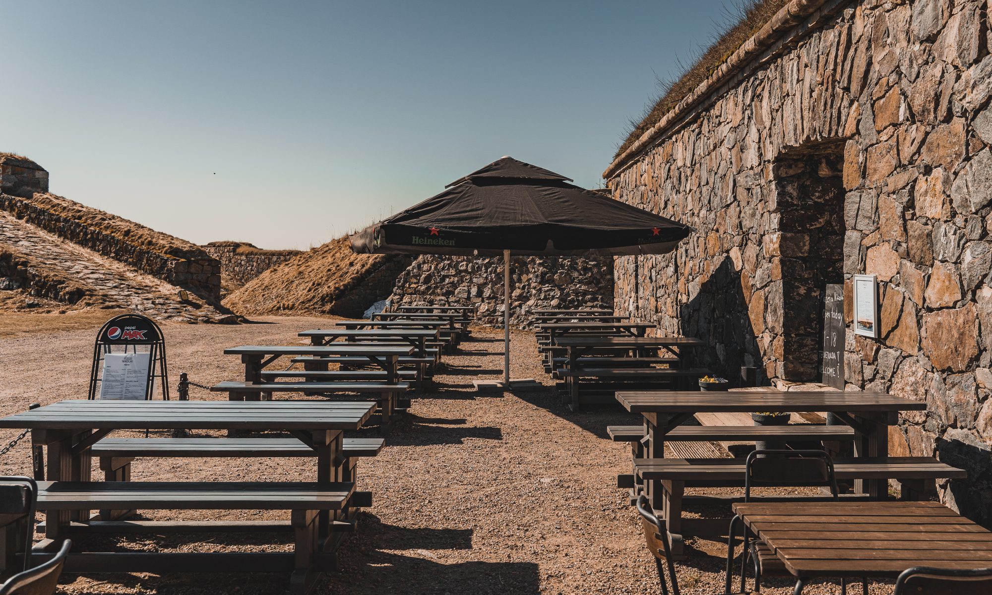Pizzapohjamme paistetaan rapeaksi kiviarinauunissa, linnoituksen suojissa. Tarjolla on myös salaatteja.